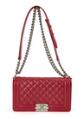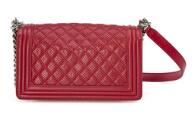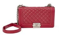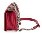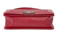 “Boy” taske af rødt delvist perforeret læder med sølvfarvede beslag, kædestrop, et rum med en indvendig lomme og beige stof for. H. 16 x B. 25 x D. 8,5 cm. 2014.