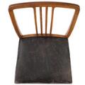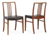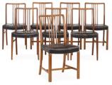 Sæt på otte spisestole af eg. Sæde betrukket med sort skind. Formgivet 1942. Udført hos snedkermester Jørgen Christensen, 1940'erne. (8)