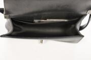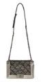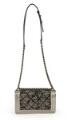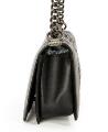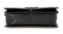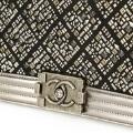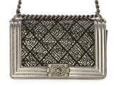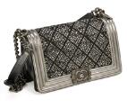 A “Boy” bag of silver leather and black canvass with decorations, silver tone hardware, chain strap, one compartment with one interior pocket and black leather lining. H. 15 x W. 25 x D. 8 cm. 2017.