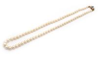 Perlehalskæde i forløb prydet med talrige kulturperler og perle- og aquamarinlås af 14 kt. guld prydet med smaragdslebet aquamarin og kulturperler. Samt tre perleøreskruer af 14 kt. guld hver prydet med kulturperle. Perle diam. 5–8,8 mm. L. 54 cm. (4)