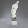 Skulptur af presset massiv hvid granit, i form af afklædende dame, med bukser af gråbroget granit. Nyere produktion. H. inkl. sokkel 142.