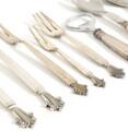 Comprising: 7 dinner knives with short handle L. 22.5 cm., 5 large dinner knives with short handle L. 25 cm., 1 large dinner forks L. 20 cm., 1 dinner fork L. 18.7 cm., 10 dinner forks L. 18.2 cm., 2 large dinner forks L. 20.3 cm., 12 dessert spoons L. 17.5 cm., 12 coffeespoons L. 11.5 cm., 1 small salad set L. 16 cm., 1 bottle opener L. 11.7 cm., 1 server L. 22.2 cm., 1 soup spoon L. 16.7 cm., 1 teaspoon L. 13 cm., 1 pastry fork L. 14.3 cm., 1 short cold cut fork L. 12 cm., 1 medium cold cut fork L. 15.7 cm.
