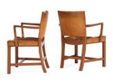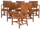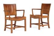 “Den Røde Stol”. Et sæt på seks armstole med stel af mahogni. Sæde og ryg betrukket med sømbeslået originalt patineret nigerskind. Model 3758A. Formgivet 1930. Udført 1930–1940'erne hos Rud. Rasmussens Snedkerier med mærkat. (6)
