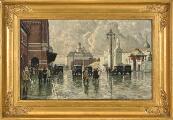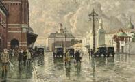 People on Bernstorffsgade in front of the entrance to the Central Station, opposite the entrance to Tivoli. In the background Axelborg, the agricultural council building, which was built 1918–1921. 1920s. Signed Paul Fischer. Oil on panel. 36×59 cm.