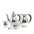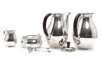 A silver coffee set comprising coffee pot and milk jug with wooden handles, creamer, sugar bowl and sugar thong. Made by A. Dragsted 1948. Total weight app. 1180 g. H. 5–20 cm. (5)