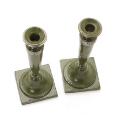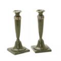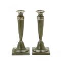 A pair of Northern German Empire green-painted pewter candlesticks, conical stems on foursided bases. Early 19th c. H. 24 cm. (2)