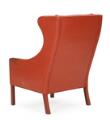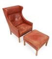 Wingback chair and matching stool with mahogany legs. Sides, back and loose cushions upholstered with red brownish patinated leather. Designed 1963. Model 2204 and 2202. Manufactured and marked by Fredericia Stolefabrik. (2)