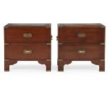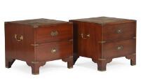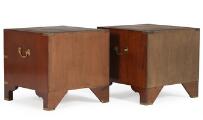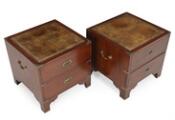 A pair of mahogany 'Military style' side tables, front with two drawers, patinated brass mountings, top of partly gilt leather. 20th century. H. 50. W. 52. D. 52 cm. (2)