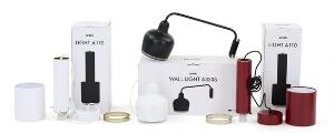 Fire lamper. To model A110 pendler. En model A330S væglampe samt A330S pendel. Hvid, sort og rød lakeret metal. Udført hos Artek. (4)