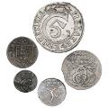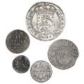 Christian V, hvid 1686, H 87, 2 skilling 1681, H 74B, mark 1675, H 73, scar, mark 1692, H 95C, 2 mark 1681, H 69, flan crack, die flaw, in total 5 pcs