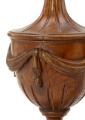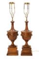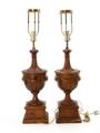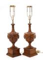 Et par engelske Adam stil bordlamper af træ, urneformede stammer prydede med draperi, på firsidede fodstykker. 20. årh. H. 54/ca. 85 cm. (2)