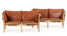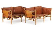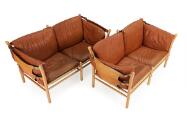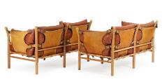 “Illona”. A pair of two-seater sofas with beech frame. Sides and back stretched with full-grain leather straps. Loose cushions upholstered with brown leather. Designed 1971. Manufactured by Norell, Sweden. L. 156 cm. (2)