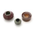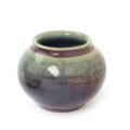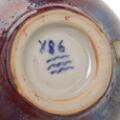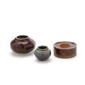 Two stoneware vases and a bowl decorated with resp. oxblood glaze with violet elements, oxblood glaze with ochre elements and bluish violet glaze with green elements. Two first signed Sonne, resp. 42–77 and 7. Made and marked by Bing & Grøndahl. Small vase signed X86. Royal Copenhagen. H. 6 cm. (3)