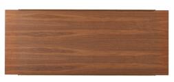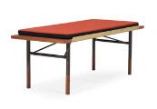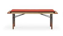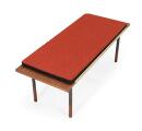 Bordbænk af valnød med stel af andoniseret metal, kantlister af messing, løs vendbar hynde med betræk af rødt/sort uld designet af Hanne Vedel. Formgivet 1953. Udført og mærket hos Onecollection. L. 112.