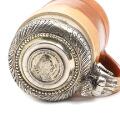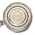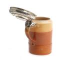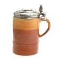 A Danish salt-glazed stoneware tankard, silver lid inlaid with a silver coin. Maker Jens Pedersen Komløv, Copenhagen town mark 1719. H. 20 cm.