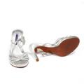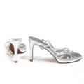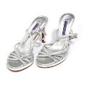 Et par stiletter af sølvfarvet læder med justerbar ankelstrop. Str. 6. Hæl højde ca. 9 cm.