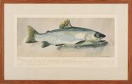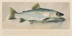 Salmon. Signed and dated in print Svend Saabye, 1956. Lithograph in colours, in passepartout ith offset writing. Visible size 34.5×60 cm.