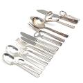 Comprising: 12 dinner knives, 12 dinner forks, 10 dinner spoons, 9 luncheon knives, 9 luncheon forks, 12 dessert spoons, 6 pastry forks, 11 teaspoons, 1 serving spoon, 1 gravy ladle, 1 marmelade spoon, 1 meat fork, 1 cake server, 1 cake knife, 1 bottle opener.
