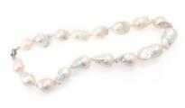 Perlehalskæde i forløb prydet med talrige barokke South Sea perler og lås af metal. Perler ca. 14,5×17,0–17,5×31,3 mm. L. ca. 45 cm.