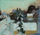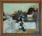 Udsigt over huse. Nytårsmorgen. Signeret SHM 40. Olie på lærred. 46×55 cm.