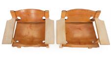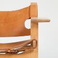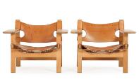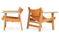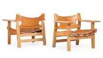 “Den spanske stol”. Et par armstole af massiv eg, sæde og ryg udspændt med patineret cognacfarvet kernelæder. Model 2226. Formgivet 1958. Udført og mærket hos Fredericia Stolefabrik. (2)