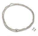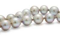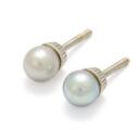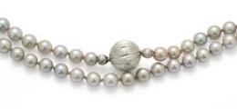 Lang perlehalskæde med prydet med talrige ferskvandskulturperler og kuglelås af 14 kt. satineret hvidguld. Samt et par perleørestikker af 14 kt. hvidguld hver prydet med ferskvandskulturperler. Samlet vægt ca. 83,5 g. Perle diam. ca. 6,5–6,9 mm. Lås diam. 14 mm. L. 132 cm. inkl. lås. (3)