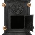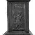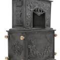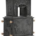 Norsk vindovn i to etager af støbejern med greb og ben af messing og rør af kobber, ovnplader med Neptun og havmænd i relief og overdel med Christian IIV's monogram samt elefant. Efter Henrik Bech. Fossum, ca. 1767. H. 216. B. 82. D. 45