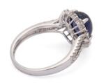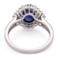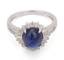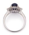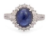 A sapphire and diamond ring set with a cabochon sapphire weighing app. 3.69 ct. and numerous baguette- and brilliant-cut diamonds, mounted in 18k white gold. Weight app. 3.8 g. W. 13.5 mm. Size 54.