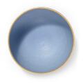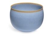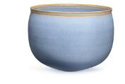 Cirkulær skål af stentøj. Dekoreret med lys blåviolet glasur, øverste kant med delvis uglaseret stregdekor. Sign. alev, M77. Unik. H. 15,3–15,5. Diam. 20.