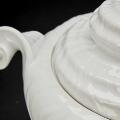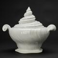 “Hvid Konkylie”. Suppeterrin af porcelæn, dekoreret med klar glasur. Tryksign. monogram, 183 og 182. Kgl. P. H. 28. B. inkl. hanke 33.