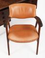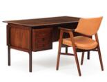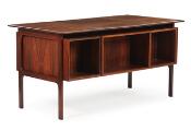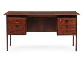 Fritstående skrivebord af palisander, front med seks skuffer og bagside med tre rum, samt armstol af palisander, betrukket i sæde og ryg med brunt skind. Udført hos Brouer Møbelfabrik og Høng Stolefabrik. 1960'erne. H. 72. L. 144. B. 74. (2)