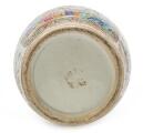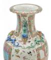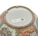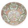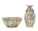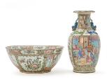 Kinesisk vase af porcelæn, balusterformet, dekoreret i farver og guld i Canton maner med paladsscener, hanke og modellerede i form af tempelløber omgivet af drager. H. 42 cm. Samt stor bowle Diam. 41 cm. Republik. (2)