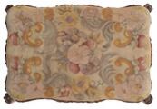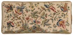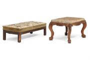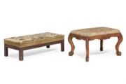Two stools of resp. carved and leather-covered wood, both upholstered with embroidery with floral motifs. Early 20th century. H. 46/31 cm. L. 80/105 cm. W. 54/48 cm. (2)