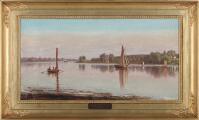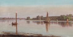 View over the water with sailing ships on a calm day. Signed monogram. Oil on canvas. 30×59 cm.