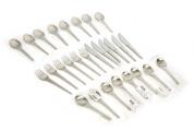 Bestående af: 6 middagsknive L. 22., 6 middagsgafler L. 18,8., 8 middagsskeer L. 19,5., 8 store teskeer L. 15.