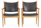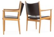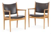 “JH 713”. A pair of oak armchairs. Seat and back upholstered with dark brown leather. Designed 1958. Made 1960s by cabinetmaker Johannes Hansen, with plaquette. (2)