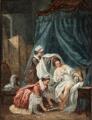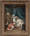 A young woman in her boudoir being dressed by two maids. Unsigned. Oil on canvas. 35×27 cm.