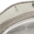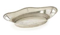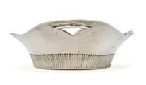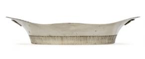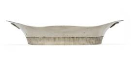 Tysk brødkurv af sølv, oval og svungen model, toprand smedet med stiliseret bladranke, hver ende med vifteformet hul som håndtag, punslet og riflet nedre kant, oval og flad bund, graveret med fyrstekronet spejlmonogram L for Prinsesse Louise af Slesvig-Holsten-Sønderborg-Glücksborg (1858–1936). Bremer Silberwaren-Fabrik, lødighed 800. Ca. 1910. Vægt 318 g. H. 9 cm. B. 18 cm. L. 31,5 cm.