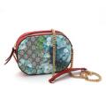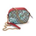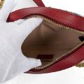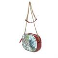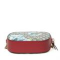 “Blooms GG Supreme” taske af rødt læder og brunt kanvas med blåt og grønt blomsterprint, gylden kædehank, en indvendig åben lomm og lyserødt for af ruskind. H 17 x B 22 x D 6 cm.