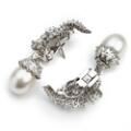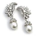 A pair of South Sea pearl and diamond ear pendants each set with a cultured pear-shaped South Sea pearl and numerous brilliant, marquise and baguette-cut diamonds weighing a total of app. 8.70 ct., mounted in platinum. Colour: Wesselton (H). Clarity: VVS-SI1. Pearl diam. app. 11.5–12.5 mm. L. app. 4.5 cm. (2)