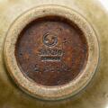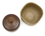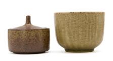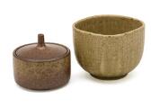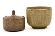 Firsidet skål af stentøj, dekoreret med mosgrøn glasur med motiv i relief. Sign. E. St. N. Udført og stemplet hos Saxbo. H. 9,5. B./L. 12,5. Samt lågskål af stentøj, dekoreret med mosgrøn-brun glasur. Sign. PL-S, 408. Udført og sign. hos Palshus. H. 9.5. Diam. 10. (2)