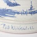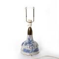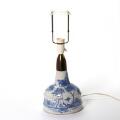 Rund bordlampe af lertøj dekoreret med blå glasur på lysegrå baggrund. Sign. Bjørn Wiinblad 62. H. inkl. skærmholder 50.