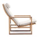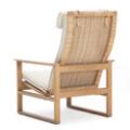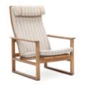 “Medestolen”. Højrygget lænestol med stel af eg. Sæde og ryg udspændt med flet, løse hynder betrukket med lyst stribet uld, stropper af kernelæder. Model 2254. Formgivet 1956–57. Udført hos Fredericia Stolefabrik.