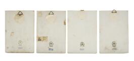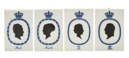 Fire plaketter af porcelæn med silhuetportrætter i kronede ovaler af Dronning Ingrid af Danmark, Kong Frederik IX af Danmark, Prinsesse Margrethe (II) af Danmark og Prins Henrik af Danmark. Den Kongelige Porcelainsfabrik. Ca. 1967. 13×9 cm. (4)