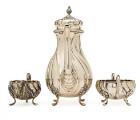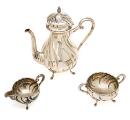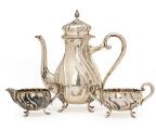 A Danish Rococo style silver coffee set, comprising a coffeepot, a creamer and a sugar bowl. Cohr 1937. Weight 985 g. (3)