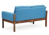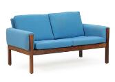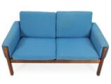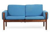 “AP 62”. Fritstående to-personers sofa med stel og synlige tapninger på armlæn af palisander, armlæn sider, samt løse hynder betrukket med blåt uld. Model AP 62/2. Udført hos AP-Stolen, København. L. 137 cm.
