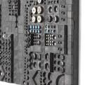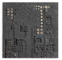 A square wall relief composed by square ceramics tiles. Some modelled and embossed with geometric and circular decor as well as raised relief decor. Decorated with matt greyish black glaze and partly decorated with greyish white, turquoise and brownish black glaze. Signed BRYK. Made by Arabia, Finland ca. 1970s. Unique. H. 48.5 cm. W. 48.3 cm. D. 3 cm.