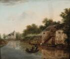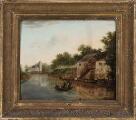 View from a river with a family in a rowing boat. Unsigned. Oil on panel. 36×43.5 cm.