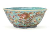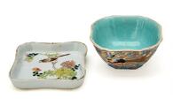 A small Chinese enamelled porcelain 'Dragon and Phoenix' bowl of square form, Tongzhi (1861–1875) seal mark and period 9.5×9.5 cm. Further, a dish, 19th century, 10×10 cm. (2)