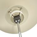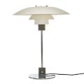 “PH 4/3”. Bordlampe med stel af forkromet metal, skærme af hvidlakeret metal samt trekantstykke af sort sandblæst, sprøjtestøbt bakelit. Formgivet 1967. Udført og mærket hos Louis Poulsen. H. 56. Diam. 45.